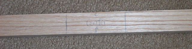 This stave I cut to a length of 68 inches. Therefore, the center would be 34 in. Measure 2 inches on either side for a 4 inch handle.