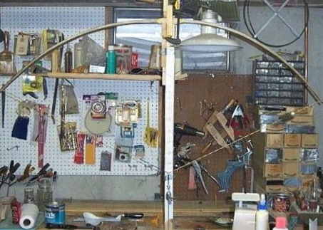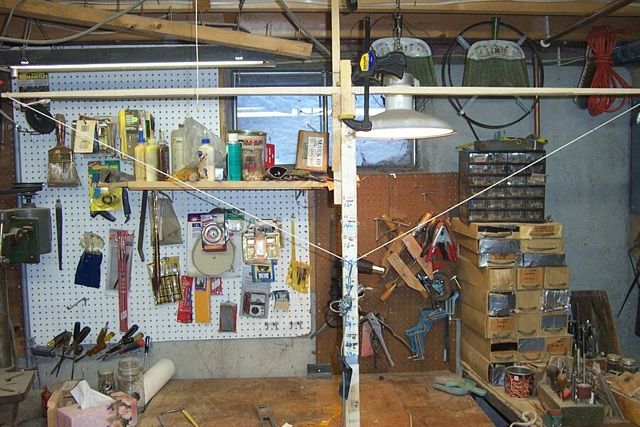 Prepare for long string tillering. I just use an old sash cord with a loop at each end. Please note the rope and pulley is described on my site under Bowmaking Directions. Also note I marked the end of the string with duct tape. I measure down 10 inches from that tape. We are shooting for nice bending limbs at this point.
