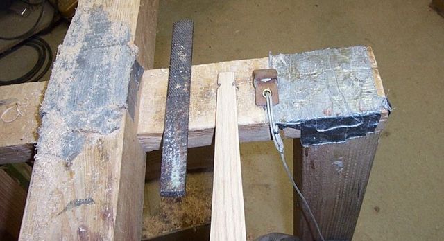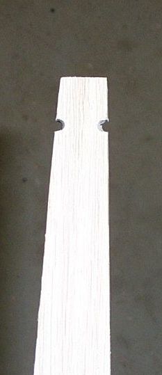 On both limbs while the save is clamped in the vice edge up measure down 1/2 inch, draw a line, 3/4 inch, draw a line, connect the corners with a diagonal making sure the nock is in the right direction, start the cut with a hack saw going down about an 1/8 inch or a little less, and widen it with 1/8 inch file. Turn the stave over and repeat. Repeat on the other limb. Rough nock should look like the picture below. Later we will round off the edges and corners of the nocks to remove unneeded wood.