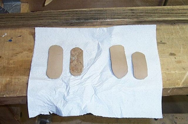 I will make the handle area easier to hold with 4 leather add ons. The large pieces are 3.5 inches long and are the width of the handle while the smaller pieces are 2.5 inches long and their width is a little less than the that of the larger pieces. Before gluing experiment with their location by putting them on dry and holding the handle. The size and number of these pieces is personal preference. Glue on the large piece and then the smaller one over it. Do this on the back and the belly.