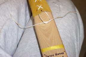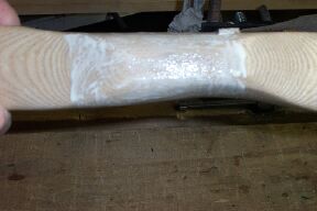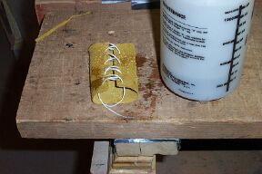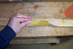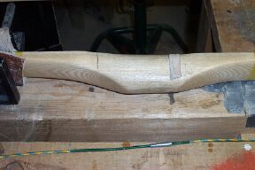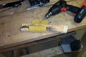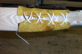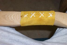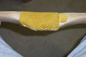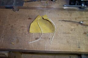I shoot the narrow 1.5 inches above center. Cut a suitable sized leather strip. Bevel the bottom edge with sandpaper. If this piece isn't thick enough cut another a little narrower and glue it on the first piece. This is the arrow shelf.