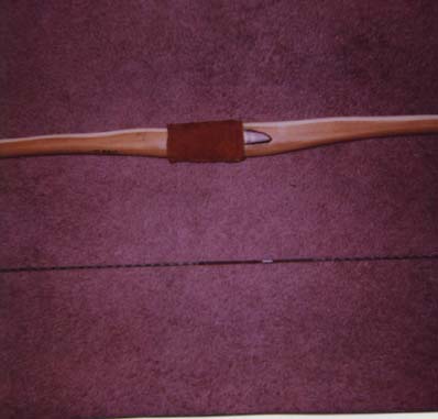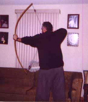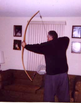 Traditionally, osage and yew are considered to be premier bow woods and both are highly prized by bowyers. Osage is native to North America but is found mainly in the midwest and west with some exceptions. It derives its name from the Osage Indians of Oaklahoma. The first bow drawn in the illustration is a flat\bow with a slightly rounded belly. The bow is made from osage orange which was cut in Texas. The wood at first is a pale yellow color but gradually over time takes on a rich copper color. This bow is 65 inches long from tip to tip and draws 55 pounds at 26 inches. It is made in the Native American flatbow style. The second bow is an American longbow style made from yew cut in the Oregon Cascades at 2000 feet. English longbows have the handle area as the widest part of the bow, the belly is very rounded and are generally around the archer's height or slightly less. This one is 69 inches from to tip and draws 60 pounds at 26 inches.The wood was cut in 1991. The sides are rectangular and the belly is rounded. In the English longbow the belly is rounded but has no rectangular areas at all. The English longbow is also tillered to bend in the handle. Yew is an evergreen conifer. Yew for a bow wood is relatively soft. To protect the bow this one is backed with rawhide. The nocks are inlaid with cow horn and the arrow plate is also cow horn. The last photos show the horn arrow plate.
