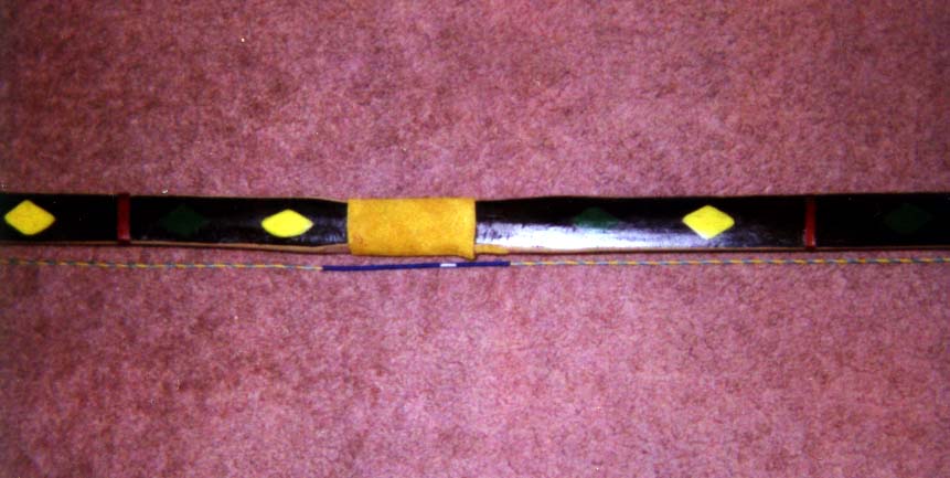 This is the handle of the bow and shows the yellow leather handle and matching arrow pass. The arrow shelf is the top of the handle and consists of 2 pieces of leather glued together and to the wood. The first piece is 1/2 in. wide and the other is 1/4 inch wide. The pieces are sanded and tapered on the bottom to blend nicely together.Both extend to nearly the thickness of the handle.