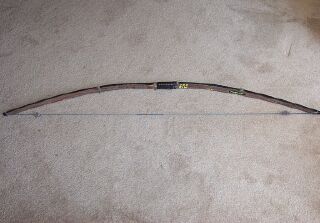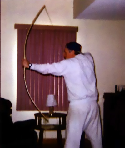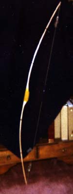This is a picture of an Australian pine (beefwood bow). The stave was a gift from Steve Sefsick and was cut in Florida. She draws 52# at 26 inches. The back of the stave showed many drying cracks, was filled in with a dilute solution of Titebond II and needed a silk backing for insurance.